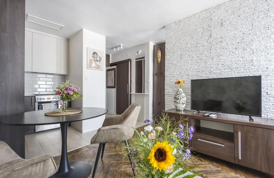 Featuring views of the river, the 30 m² Powisle Skyview Apartment Warsaw is situated in the Srodmiescie district of Warsaw, approximately a 25-minute walk from the Łazienki Palace on the Isle.